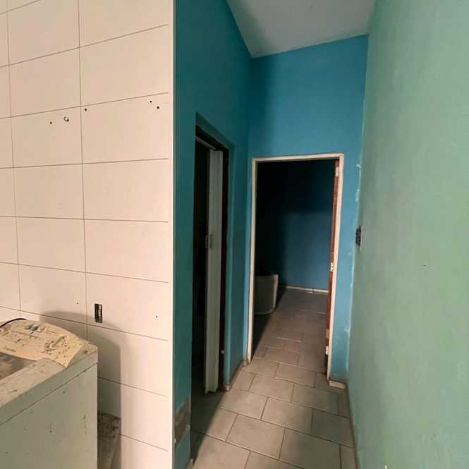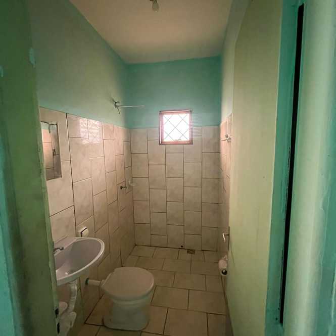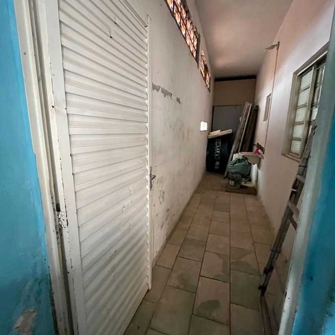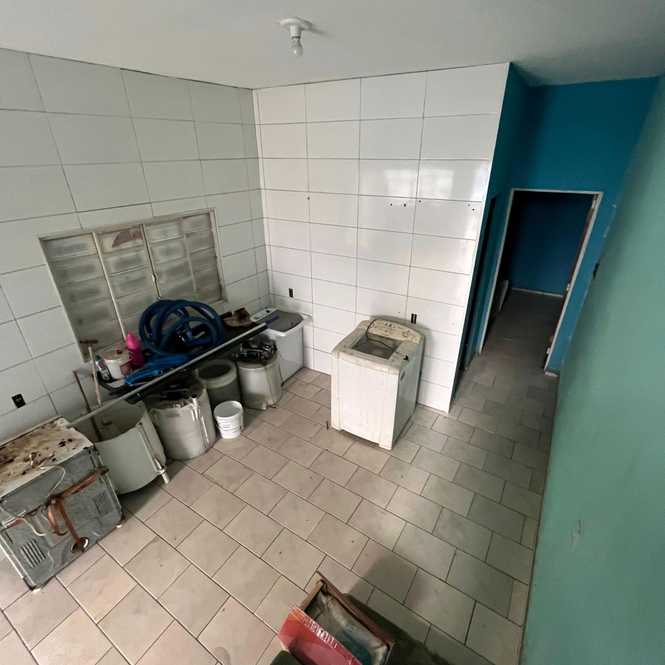Parte inferior da casa: cozinha, sala de jantar, corredor para lavanderia, banheiro social, quarto e casa de máquina da piscina.